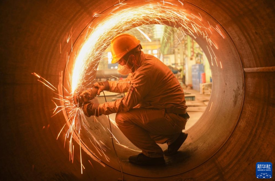 四川省眉山市天府新区にある中建鋼構四川有限公司の工場で、鋼構造製品の製造作業に勤しむ作業員(2月24日撮影・翁光建)。