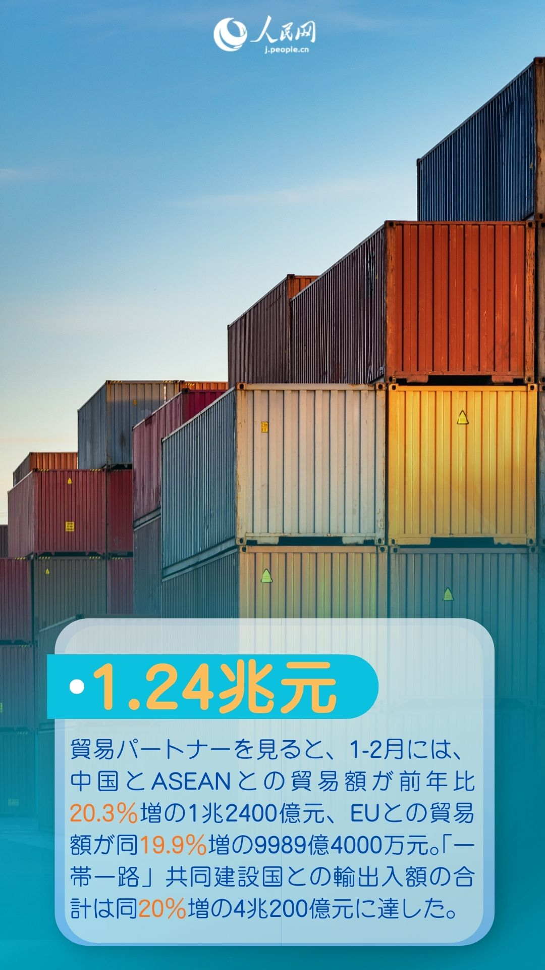 税関総署が3月10日に発表したデータによると、2026年1-2月には、中国の物品貿易の輸出入総額が前年同期比18.3%増の7兆7300億元(1元は約23.0円)に達した。輸出・輸入ともに急速に増加し、そのうち民間企業の活力が目立った。また、ASEAN、欧州連合(EU)、「一帯一路」(the Belt and Road)共同建設国との貿易が力強い伸びを示し、対外貿易は安定の中で成長の流れを保ち、レジリエンスと活力がさらに顕在化した。