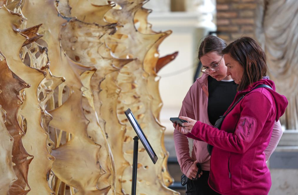 1日、ローマ国立博物館・ディオクレティアヌス浴場で、鄔建安さんの作品を鑑賞する来場者。(ローマ=新華社記者/王楷焱)