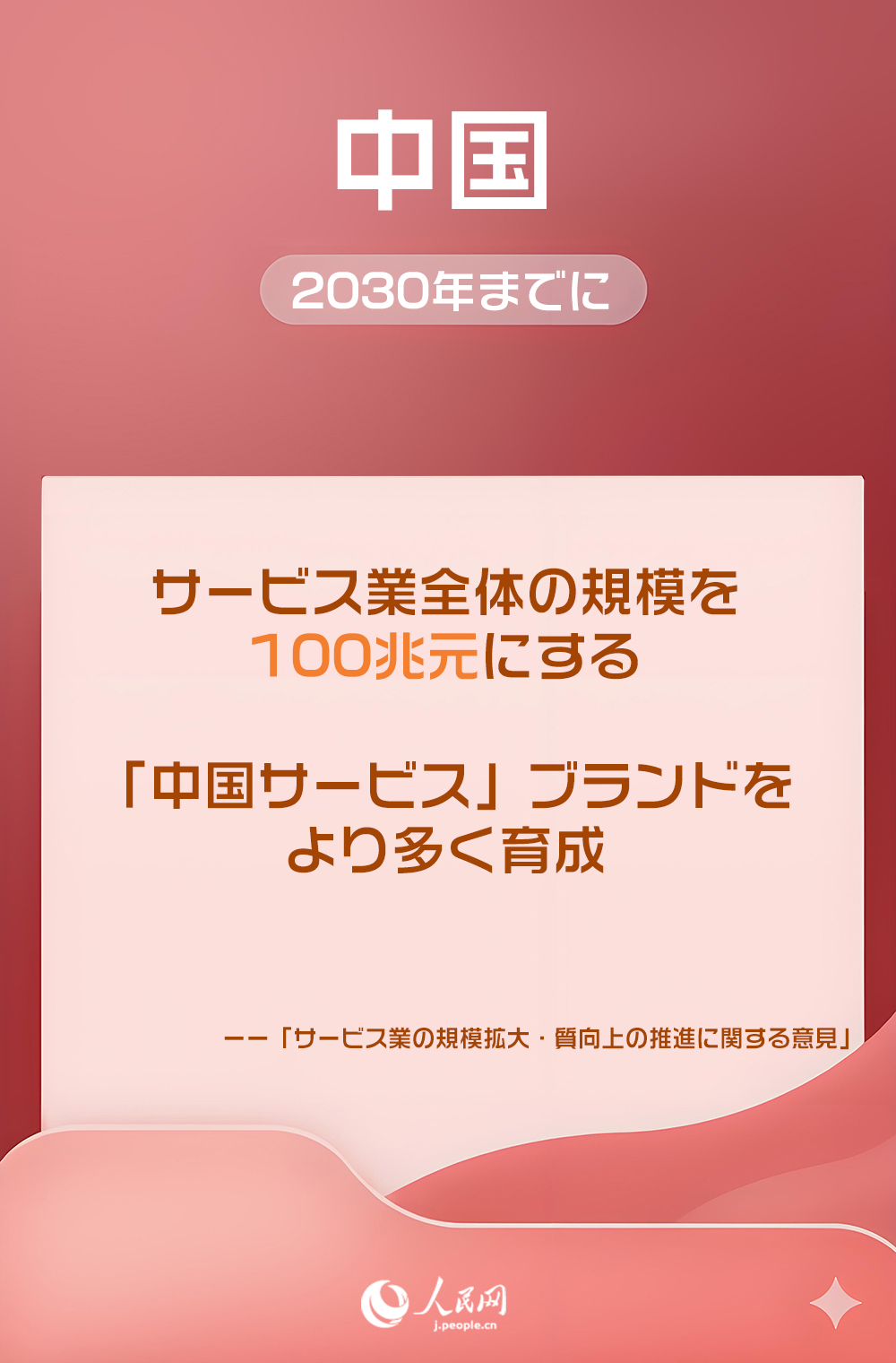同意見は、「2030年までに、サービス業全体の規模を100兆元(1元は約23.3円)にし、『中国サービス』ブランドをより多く育成し、中国のサービス業の世界的な競争力と影響力を目に見えて増強し、人々の獲得感を引き続き向上させる」という目標を明確に打ち出した。