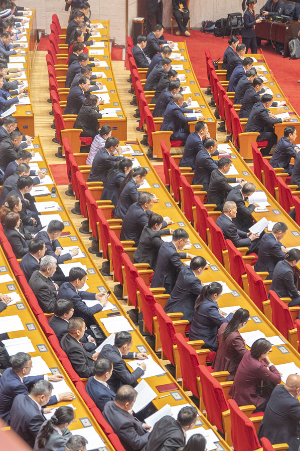 代表たちが政府活動報告を真剣に聴取している。童臻熙 撮影