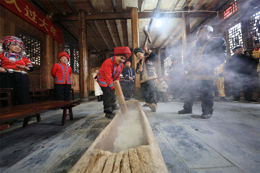 龍山県召市鎮神州社区(コミュニティ)馬洛溝村で、村民が餅つきを行っている。曾祥輝 撮影 訳者: 王冰菁 校閲者: 瞿莎蔚 記事出処:湖南省政府中国語ポータルサイト