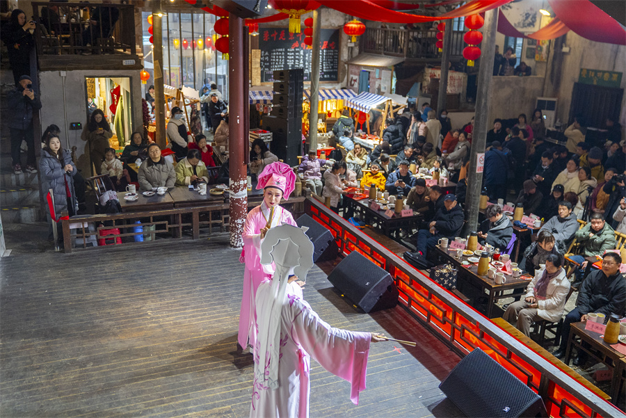 近日、長沙市東茅街の茶館で、俳優が伝統的な演目「十八相送」を披露している。 童臻熙 撮影