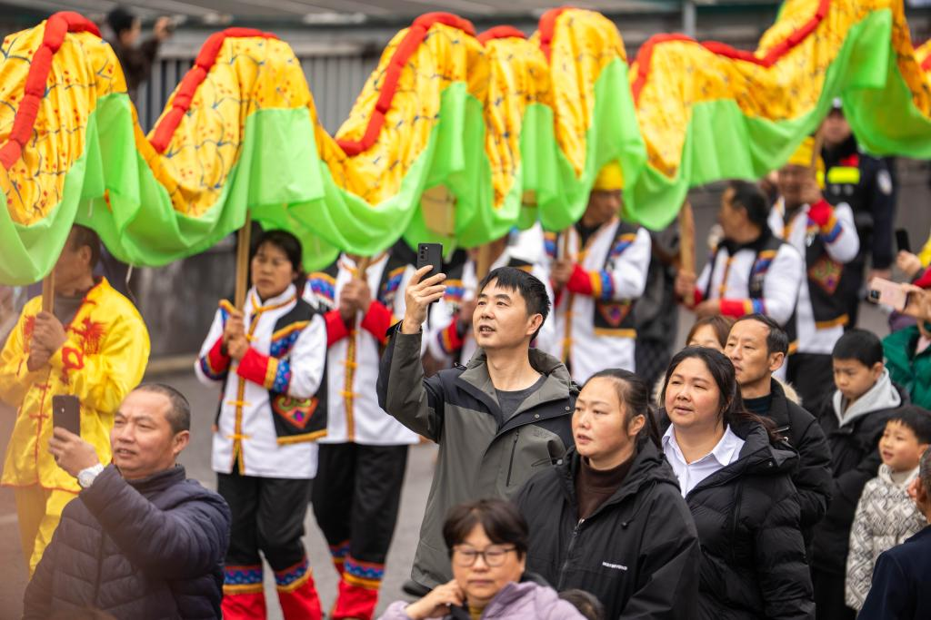 3日、張家界市永定区でパレードを楽しむ人々。(張家界=新華社記者/陳思汗)