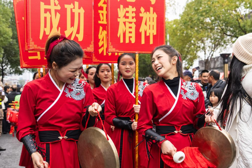 3日、張家界市永定区を練り歩く地元民間芸能団体の演者。(張家界=新華社記者/陳思汗)