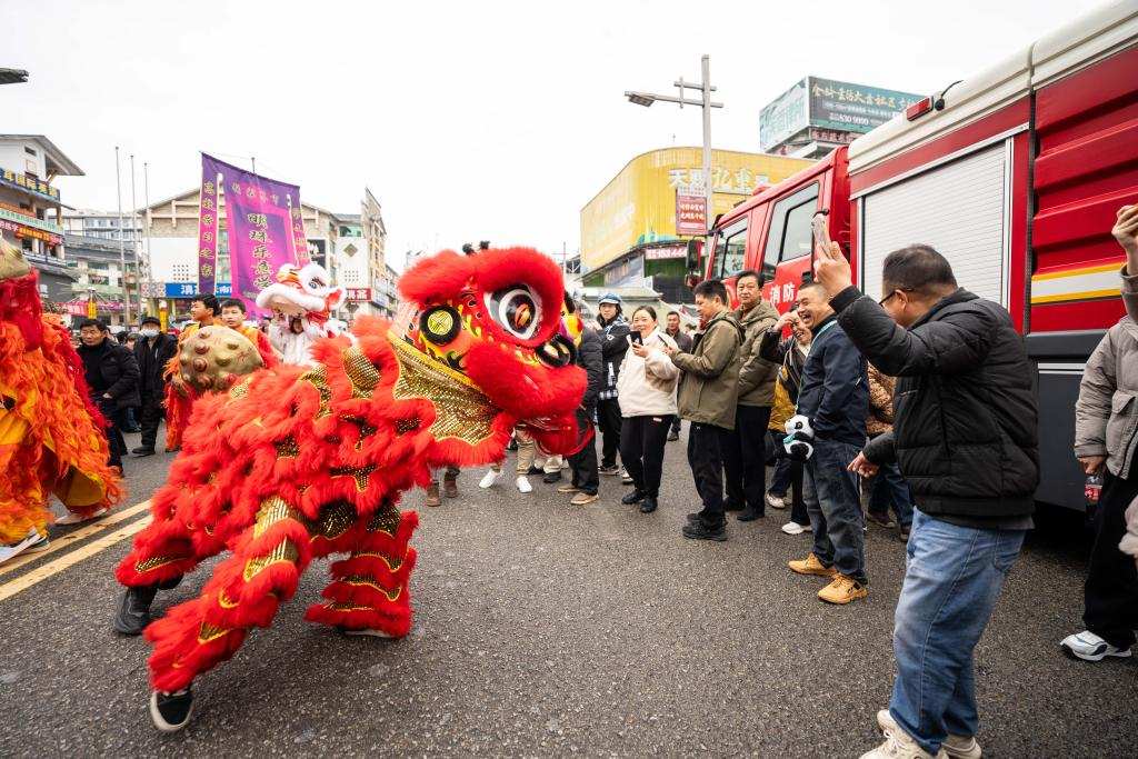 3日、張家界市永定区で披露された獅子舞。(張家界=新華社記者/陳思汗)