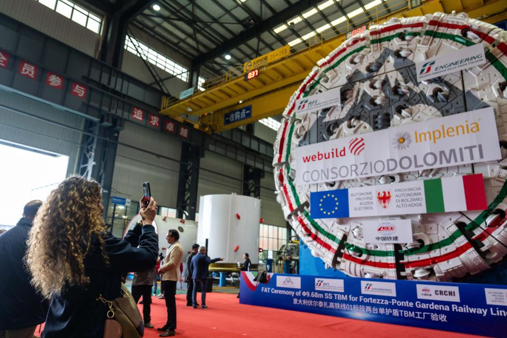 26日、中国鉄建重工集団長沙第2産業パークで、イタリアの鉄道建設用TBMを撮影する顧客代表。(長沙=新華社記者/陳思汗)