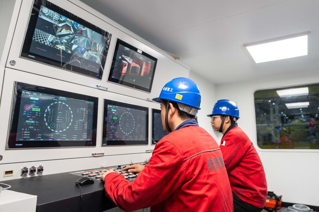 26日、中国鉄建重工集団長沙第2産業パークで、イタリアの鉄道建設用TBMの調整作業を行う技術者。(長沙=新華社記者/陳思汗)
