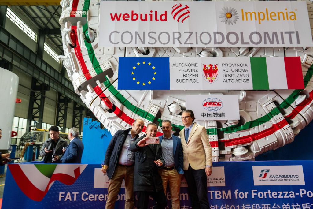 26日、中国鉄建重工集団長沙第2産業パークで完成したイタリアの鉄道建設用TBMを背景に記念撮影する顧客代表。(長沙=新華社記者/陳思汗)