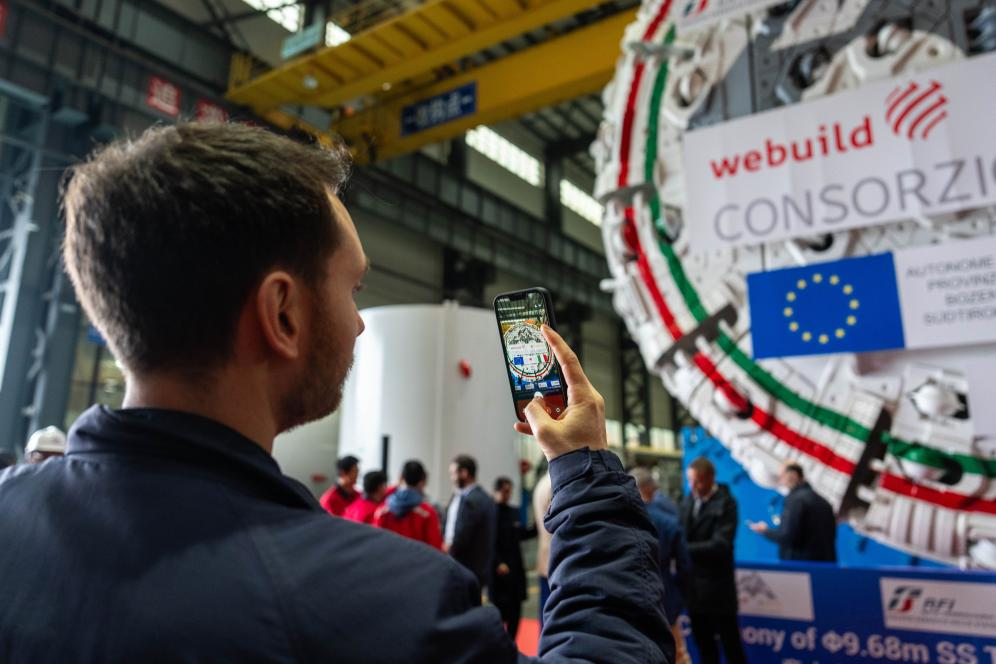 26日、中国鉄建重工集団長沙第2産業パークで完成したイタリアの鉄道建設用TBMを撮影する顧客代表。(長沙=新華社記者/陳思汗)