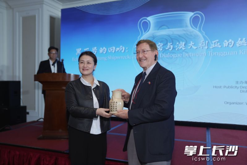 意見交換の場では、長沙市委員会宣伝部副部長・市政府新聞弁公室主任・長沙市馬欄山宣伝文化センター主任の楊溢氏が、代表団団長ジョン・レスリー・ランド氏に銅官窯の友好記念品を贈呈し、陶磁器を媒介として中豪友好の瞬間を象徴的に刻んだ。