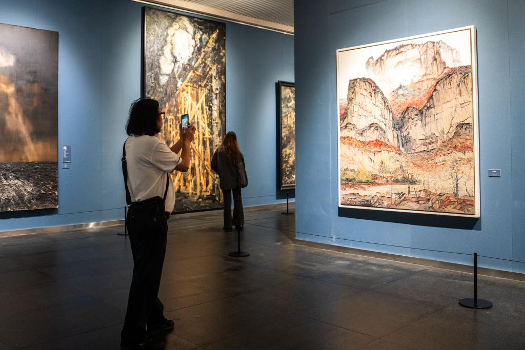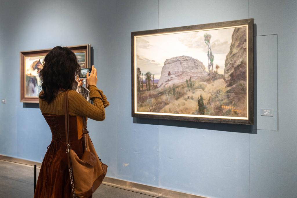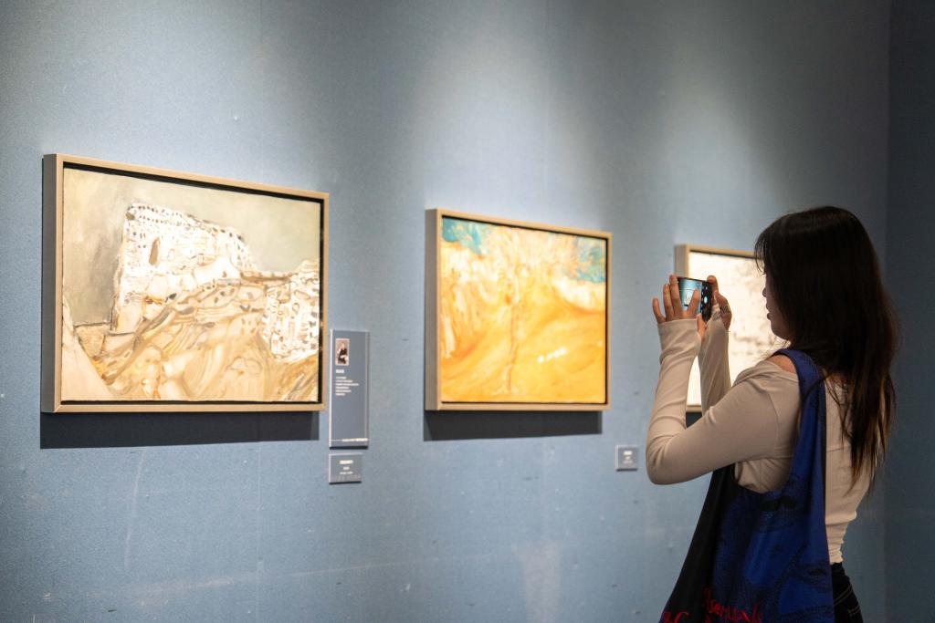 21日、李自健美術館「東方意蘊・時代精神-中国写意油画大展」で作品を撮影する人。(長沙=新華社記者/陳思汗)
