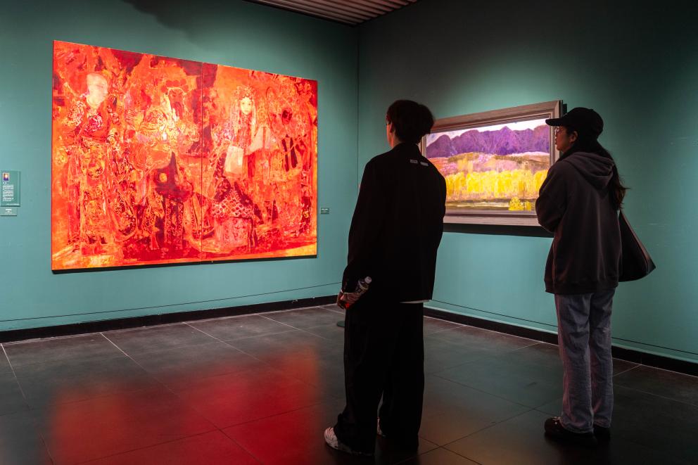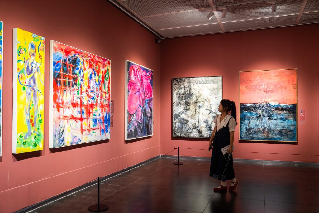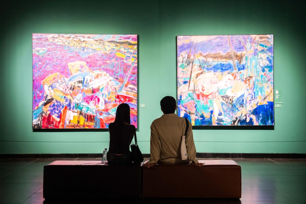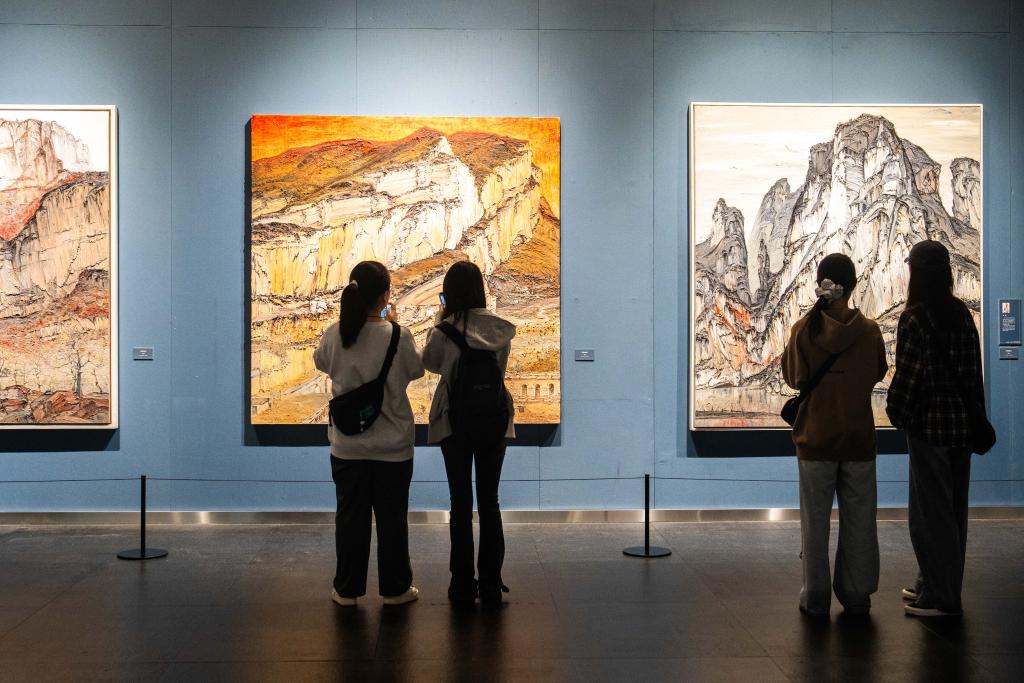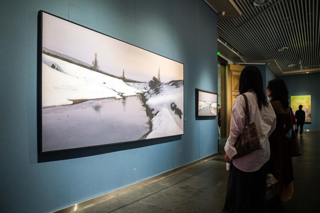 21日、李自健美術館「東方意蘊・時代精神-中国写意油画大展」で作品を見る人。(長沙=新華社記者/陳思汗)