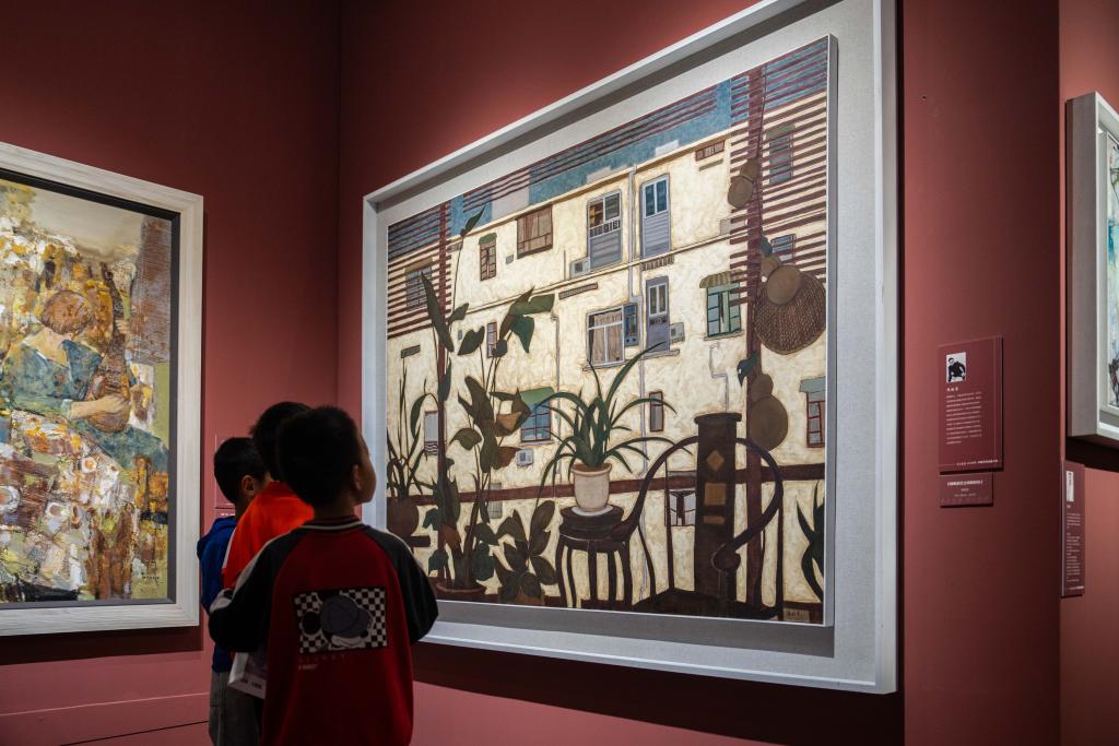 21日、李自健美術館「東方意蘊・時代精神-中国写意油画大展」で作品を見る人たち。(長沙=新華社記者/陳思汗)