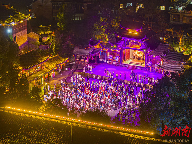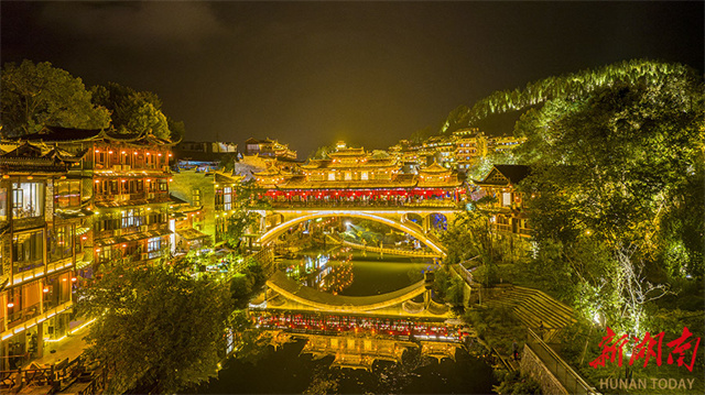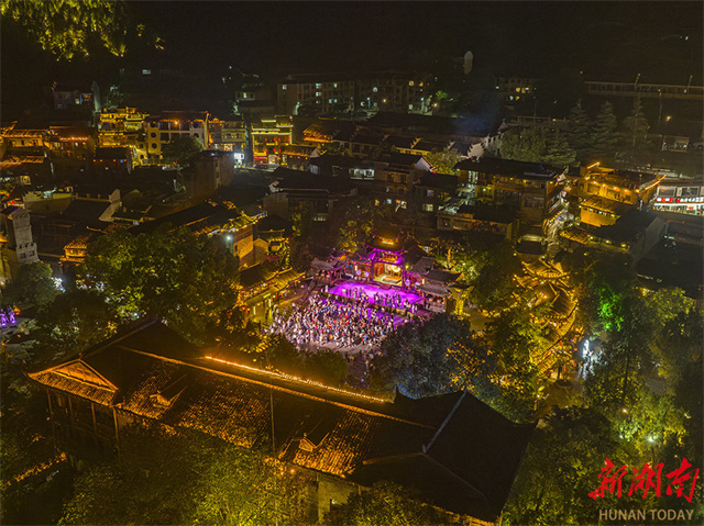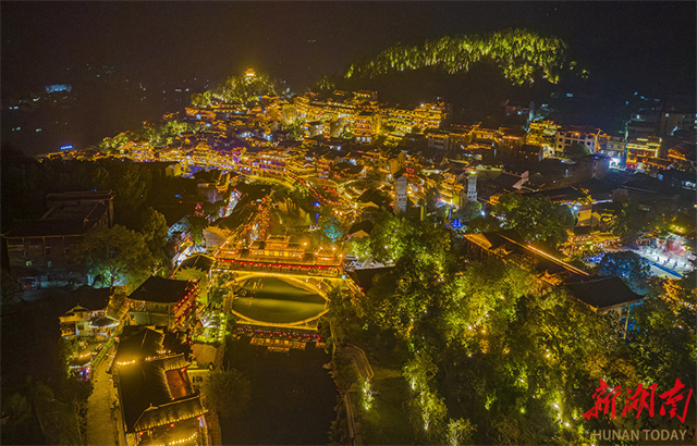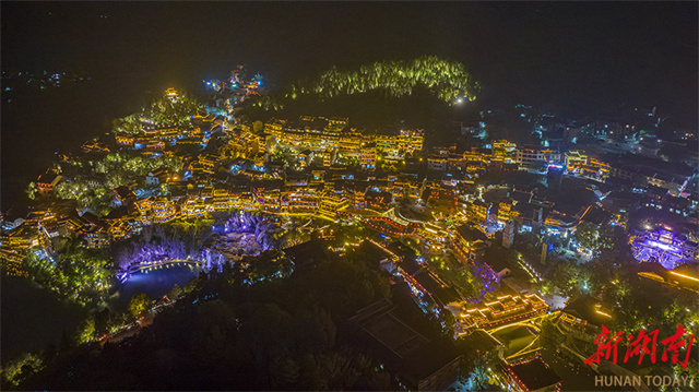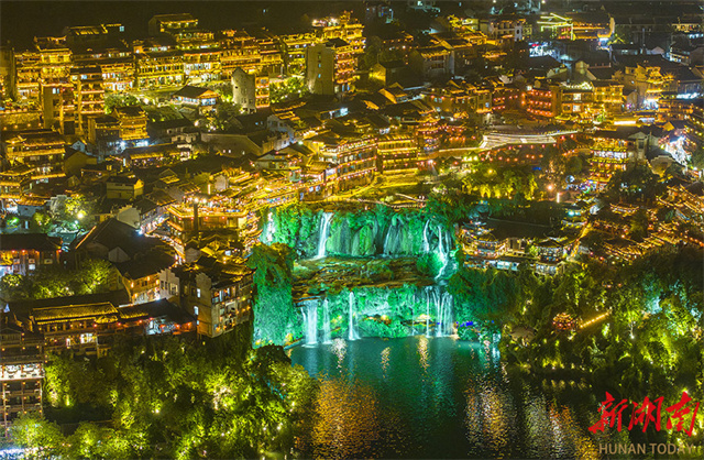 9月22日夜、永順県芙蓉鎮景勝地では明かりが煌めき、滝と古い建築物が照明に照らされて互いに引き立て合っていた。近年、この景勝地はナイトタイムエコノミー(夜間経済)を発展させ、没入型ナイトツアー体験を作り出し、文化観光産業の活発な発展を推進している