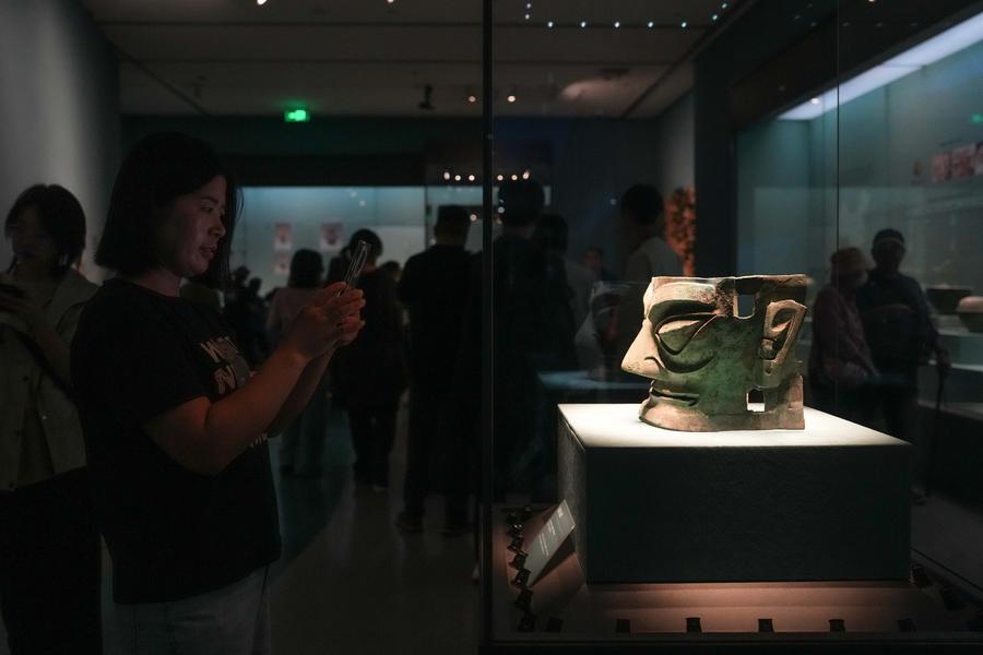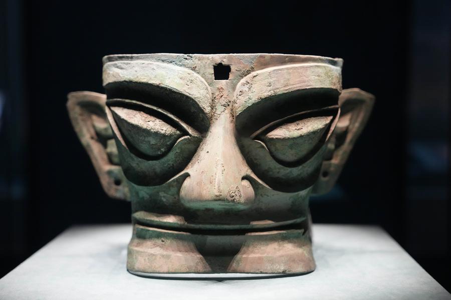 4日、長沙博物館「不尽長江滾滾来-長江と中華文明」特別展に展示された青銅仮面。(長沙=新華社記者/薛宇舸)