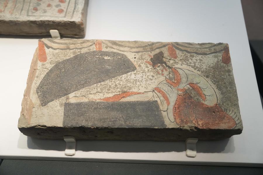 4日、長沙博物館「西北風来塞柳長青-甘粛魏晋画像磚」特別展に展示された彩絵仕女開箱図画像磚。(長沙=新華社記者/薛宇舸)