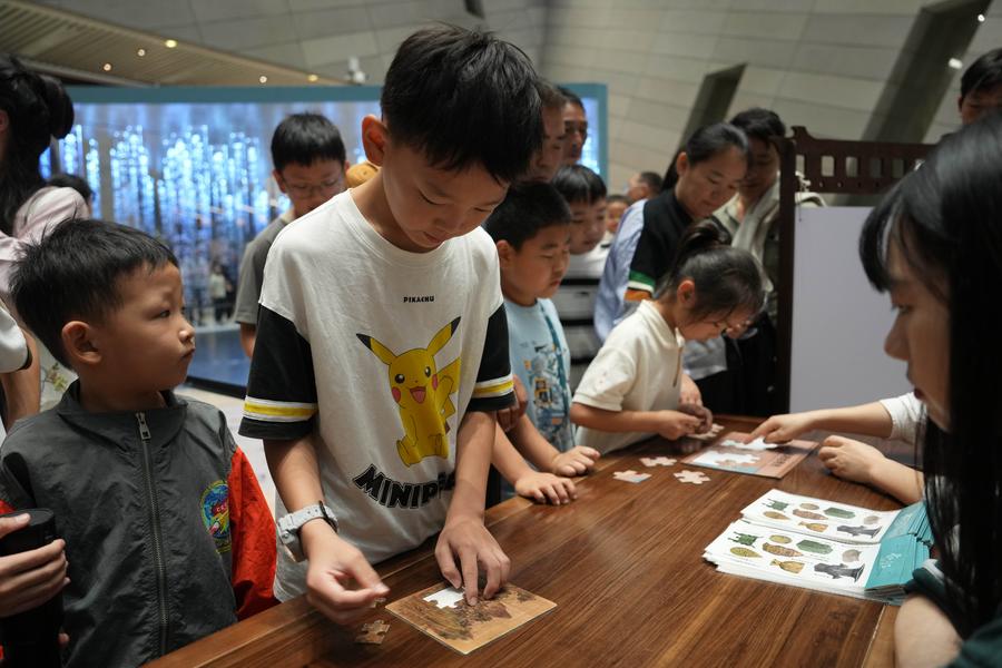 4日、長沙博物館の長江をテーマにした参加型イベントで、パズルをする子どもたち。(長沙=新華社記者/薛宇舸)